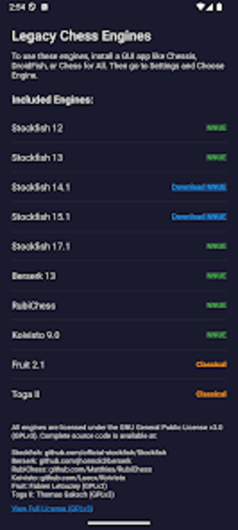 Legacy Chess Engines เป็นแอปพลิเคชัน Android ฟรีที่มีการรวบรวมเครื่องยนต์หมากรุก UCI ที่ทรงพลัง 10 ตัว แอปพลิเคชันนี้ออกแบบมาเพื่อรวมเข้ากับแอป GUI หมากรุกยอดนิยม เช่น Chessis, DroidFish และ Chess for All ทำให้กระบวนการปรับปรุงประสบการณ์การเล่นหมากรุกของคุณง่ายขึ้น ผู้ใช้สามารถติดตั้งแอปได้อย่างง่ายดายและเลือกเครื่องยนต์ผ่านการตั้งค่าของ GUI หมากรุกที่ต้องการ โดยมีการค้นหาเครื่องยนต์อัตโนมัติผ่านโปรโตคอล Open Exchange (OEX) ซึ่งช่วยขจัดการกำหนดค่าด้วยตนเอง